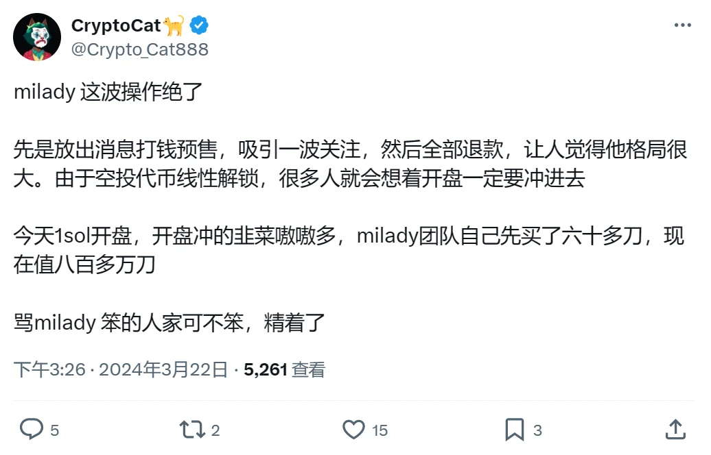 由于项目方未将募集资金注入流动性池,导致交易开始时流动性池仅有1 SOL,交易深度严重不足,代币价格波动较大。据推特用户CryptoCat描述,项目开始时购入价值60多美元的代币,却获利近800万美元。