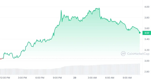 今天,WIF 的价格创下 3.97 美元的历史新高,巩固了其作为全球第三大 meme 代币的地位。过去一周,该代币升值,价格飙升超过 53%。这一飙升使其市值达到 35 亿美元,超过了 PEPE。