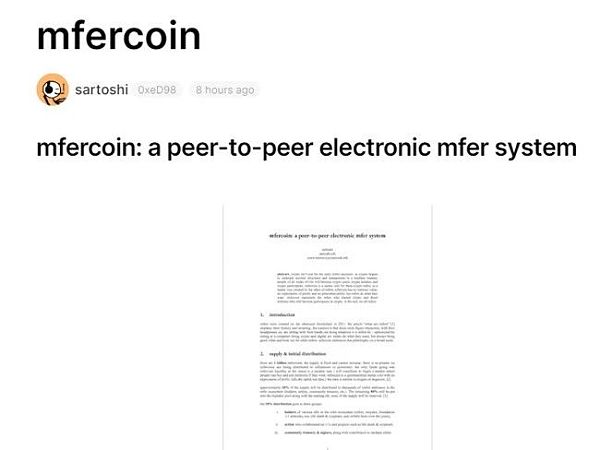 然而令人没有想到的是,北京时间2024年3月30日凌晨,sartoshi在个人平台上发文《mfercoin:点对点电子mfer系统》(mfercoin: a peer-to-peer electronic mfer system),正式宣布推出Memecoin:mfercoin。