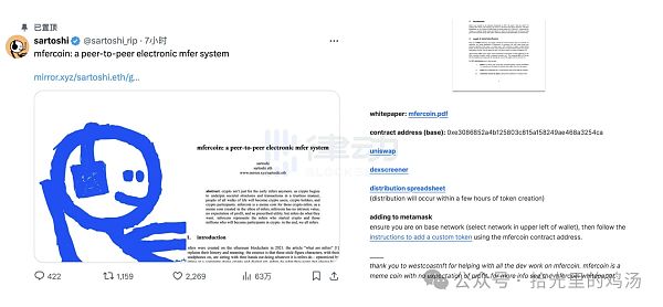 3 月 30 日凌晨,加密社区又炸锅了。知名 NFT 项目 Mfers 的创始人 Sartoshi,在 X 上宣布将在 Base 链上发行自己的 meme 代币 mfercoin,并为其附上了「白皮书」。点开这份名为「点对点数字 mfer 系统」的「白皮书」,便能看到 mfercoin 的总供应量、Uniswap 交易链接,以及 mfercoin 代币的空投细则。mfercoin 固定供应量为 10 亿枚,没有预售,并在上线后为约总量 2% 左右的代币注入流动性。