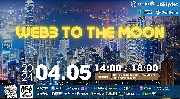 4月5日14:00,Ctalks携手UtilityNet、CBIndex、OwlSync、RealtyX、Tubes、ERA、CESS-Cumulus Encrypted Storage System、ETHEREUMGOLD、3EX、CandyDAO将在香港举办一场主题为《WEB3 TO THE MOON》的活动。该活动旨在为优质项目和web3群体提供一个沟通的平台,共同探讨行业发展,深入了解热门赛道,洞见投资先机。