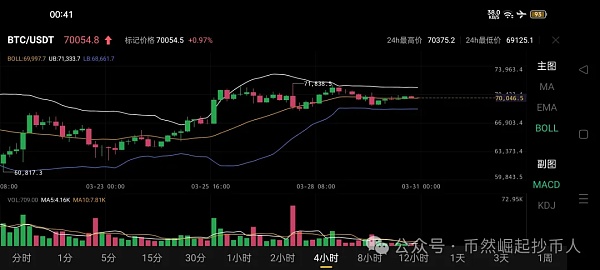 如图所示今日比特币行情分析,比特币4小时行情处于下轨附近震荡上行,附图所示处于下轨道附近持续震荡回调运行,根据附图显示绿能量柱处于回调上行趋势,币价MACD以及BOLL持续震荡有继续持续回调上涨趋势,当前币价仍旧处于震有向上走势运行,所以目前短线来看操作会有一波回调趋势,当前币价会在回调一波在操作上涨一波,个人操作建议综合来看指标比特币短线币价低多为主,今日买入建议操作买入低多一波,个人建议,仅供参考。