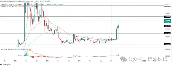 如果加密货币市场对预期减半表现出看涨反应,符合历史趋势和投资者预期,狗狗币的价格可能会与看涨模式的形成保持一致。