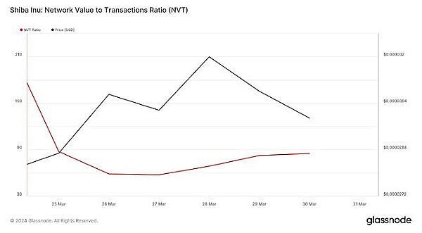 AMBCrypto 对 Glassnode 数据的分析显示,Shiba Inu 的网络价值 (NVT) 比率在 3 月 28 日略有上升。