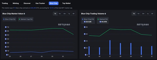 当前 19 只蓝筹合约总市值为 828,296 ETH,占 NFT 总市值的 16.15%。