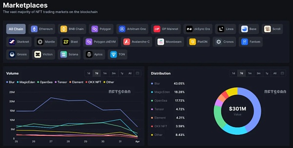 本周:大部分交易市场走势较为平缓,Blur 占市场主导,整体交易额在 3 月 27 日达到最高,0:00 时 Blur 市场最高达 2194.7 万美元,NFTScan 收录 225 个交易市场 7d 总交易额达 $301m。本周 Blur 交易额排名第一,市场交易额分布较稳定,排名前六的交易市场及占比分布: