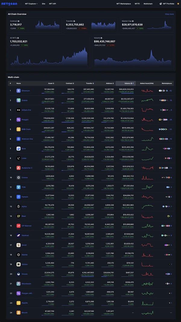 截至 2024 年 4 月 1 日,NFTScan 目前已支持 Bitcoin、Ethereum、BNBChain、Polygon、Solana、Avalanche、Arbitrum、Optimism、zkSync、Starknet、Aptos、Mantle、Linea、Base、TON、Blast、Scroll、Viction、Fantom、Polygon zkEVM、Moonbeam、PlatON、Cronos、Gnosis 24 条主流区块链网络,共产生: