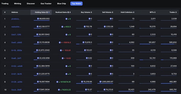 NFTScan 对排名前 1000 的 NFT 持仓价值钱包地址进行了分析,当前持有价值排名前 10 如下图所示: