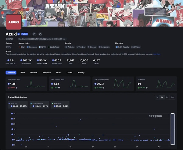 目前 NFTScan 显示, Azuki 目前地板价稳定在 4.48 ETH,最高成交价 420.7 ETH,7d 交易额为 3.2k ETH 左右,目前以太坊上总交易额已超 920.2k ETH,过去 7 天交易分布主要为 Blur: 3.04k(95.46%),Opensea: 124.45(3.91%),X2Y2: 20.35(0.64%)单位 ETH,7d 交易笔数达 635 次,7 天交易量增幅 256.96%。