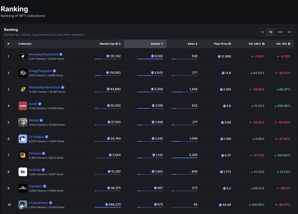 本周 BoredApeYachtClub 位列第一,地板价已跌至 12.989e 左右,7d 交易额达 6,560e;Pudgy Penguins 以 3,643e 的交易额位列第二,目前地板价为 14.8e;Azuki 以 3,186e 的交易额位列第三,目前地板价为 4.8e; 大部分蓝筹 NFT 整体市场交易额和地板价呈下跌趋势。