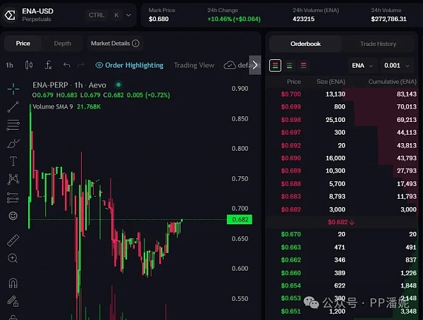 ENA代币总量150亿,初始流通9.5%,目前市场的预测价格区间集中在0.4—0.6U。不过,AEVO上ENA期货报价0.68U。