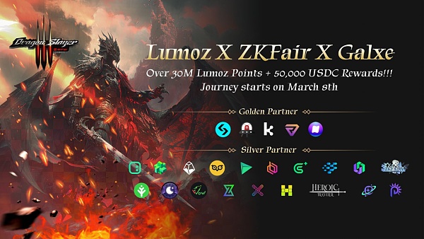 3 月 8 日,ZKFair 与 Lumoz 共同推出了首个大型游戏化生态活动 Dragon Slayer。该活动借用了屠龙少年的叙事主线,设计了一系列挑战关卡和冒险元素,使玩家能在享受游戏乐趣的同时,赢取丰厚的 Lumoz 积分和 USDC 奖励。Dragon Slayer 活动的设计精巧,总奖池提供超过 3000 万 Lumoz 积分及 50000 USDC奖励,分布在三个不断升级的关卡中,增添了玩家的挑战乐趣和期待值。Lumoz 新一轮融资将在 3 月结束并披露,预计此轮融资将达到 1.2 亿美金的估值,其与ZKFair 的这一次活动形式和活动奖励也是业内前所未有的。