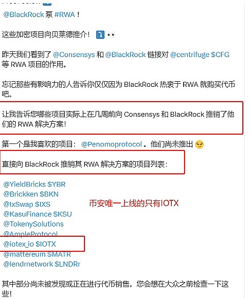 在浏览Twitter时,偶然发现一个海外知名用户的帖子,提到一些项目已经向贝莱德提交了RWA解决方案,但这些方案还未被发现。经过查证,只有IOTX与此情况相关,且已上线币安。
