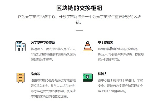 Openverse不定位为以太坊的竞争对手,它将拥抱以太坊。一些项目(如Bridge)允许您将ETH和ERC20代币带到Openverse网络,并将Openverse IBC代币发送到以太坊生态系统。其他Openverse项目包括将以太坊虚拟机引入Openverse的Ethermint和为去中心化金融(DeFi)应用程序降低dApp的使用成本。