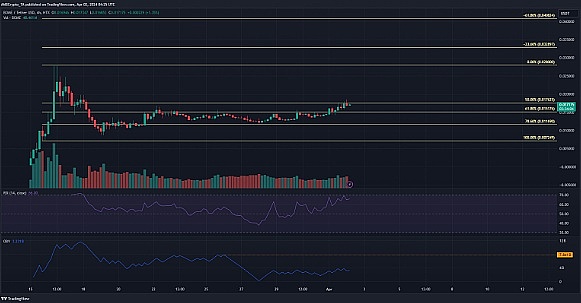 根据从 0.00725 美元到 0.028 美元的反弹,绘制了一组斐波那契回撤位。它显示,在过去十天里,61.8%回撤位0.0151美元一直是短期阻力位。