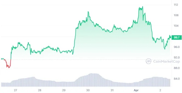 莱特币的交易价格为 98.02 美元,24 小时交易量为 24.5 亿美元,表现出了韧性。它的交易价格高于 200 天简单移动平均线。莱特币的价格较去年上涨了 9%,且市值显示出较高的流动性,今年第一季度的表现备受关注。