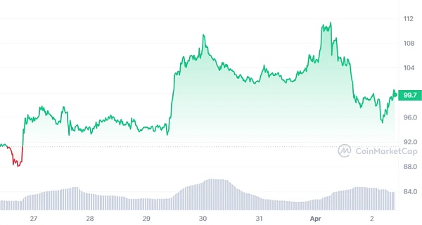 莱特币的交易价格为 98.02 美元,24 小时交易量为 24.5 亿美元,表现出了韧性。它的交易价格高于 200 天简单移动平均线。莱特币的价格较去年上涨了 9%,且市值显示出较高的流动性,今年第一季度的表现备受关注。