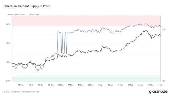尽管最近出现下跌,但以太坊的价格在下跌之前几乎恢复了 3,500 美元作为支撑位。 这导致加密货币投资者见证了利润。 目前,整个供应量的96%以上都处于盈利状态。