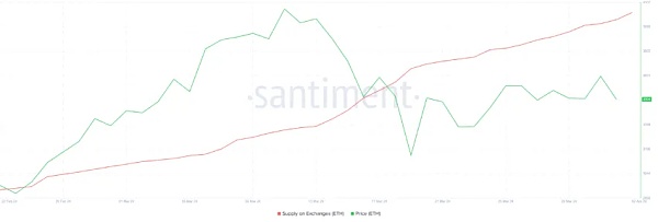 因此,ETH 很可能会进一步下跌。此外,ETH 一直在抛售,过去几个月交易所的供应量不断攀升。 投资者抛售导致超过 231 万枚 ETH 进入交易所,价值超过 76 亿美元。