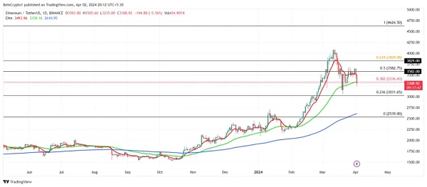 以太坊价格交易于 3,308 美元,已经失去了 50 日和 100 日指数移动平均线 (EMA) 的支撑,也低于 3,336 美元的支撑线。 这使得 ETH 非常容易测试下一个关键价格点作为支撑,即 3,031 美元。