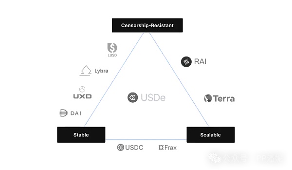 而 USDe 作为一种稳定币,希望提供了通过利用衍生品提高资本利用率的可扩展性。在 Ethena 的设计下,USDe 能够在保持资本效率的同时进行扩展,因为通过等值的空头头寸,质押的 ETH 资产可以实现完美对冲,从而仅需 1:1 的"质押"来创造合成美元。