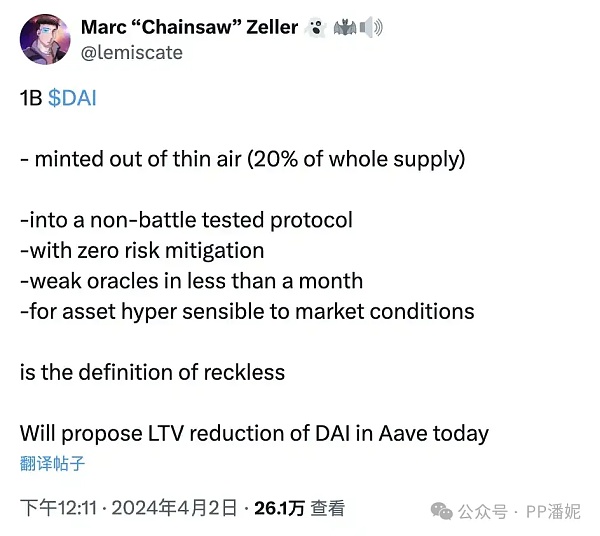 然而,就在一切看似顺利进行时,社区内部却出现了一些不同的声音。Aavechan 的创始人 Marc发表了一条推文,批评了某些 DeFi 实践的鲁莽行为,特别是指出了将占其总供应量 20% 的 1 亿美元 DAI 投入到「一个未经实战检验」的协议(Ethena)中,没有采取任何风险缓解措施,且不久前出现了弱预言机的问题。Marc 认为,这种对极易受市场条件影响的资产的处理方式极为鲁莽,并宣布将在 Aave 提议降低 DAI 的贷款价值比。