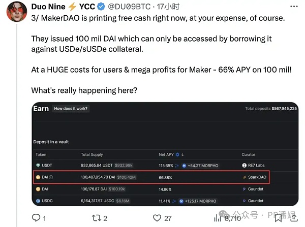 分析师 Duo Nine进一步直接指出,MakerDAO 正在「免费印钞」,且可能最终让普通投资者付出代价:「他们发行了 1 亿 DAI,只能通过用 USDe/sUSDe 作为抵押来借用。对用户来说是巨大的成本,对 Maker 来说则是巨额利润,1 亿的年化收益率达到 66%!」