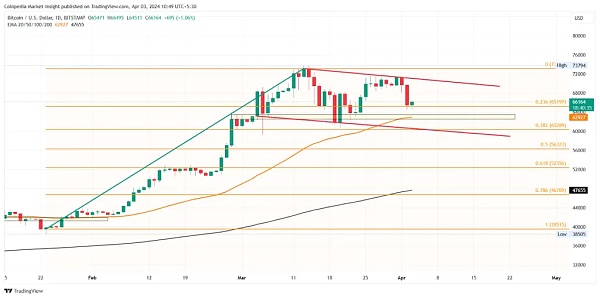 就在几天前,比特币创下了历史性的看涨收盘价,周度、月度和季度均超过了之前的历史新高。然而,这种兴奋似乎是短暂的,因为潜在的经济衰退现在威胁到了收益。笼罩在投资者心头的关键问题是,这种回落是否预示着未来还会有进一步的麻烦。比特币在突破 70,000 美元水平时面临困难,这表明可能会出现长期波动。尽管在当前趋势中观察到较高的低点,但也有较低的高点,表明市场处于不确定状态。
