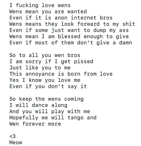 meow 表示,过去一个月内他几乎每天都会收到无数「Wen token」、「Wen airdrop」之类的问题,为此 meow 还特地用开玩笑的口吻写了一篇诗作为回应。在诗中,meow 写道:「Wens 意味着你们有多渴望 my shit,甚至有些人都已经想 dump my ass 了……」