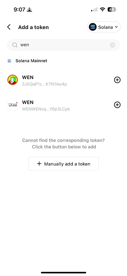 3.使用“通证管理”将“WEN”通证添加到您的 SOL 钱包中。