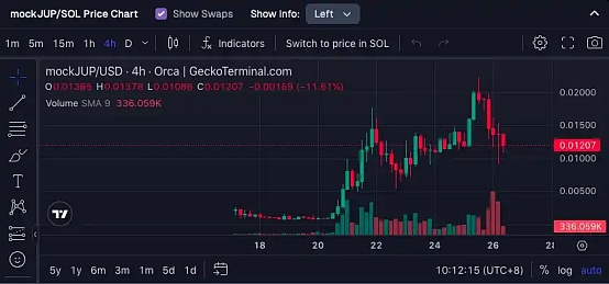 上周,Jupiter 官方完成了 mockJUP 的测试发行,有资格领取 JUP 空投的用户均可在一个较短的时间窗口内领取 mockJUP 的空投(现已关闭),尽管 meow 一直强调 mockJUP 毫无价值,但最终在社区的火热情绪下,该测试通证还是一度冲到了数千万美元的流通市值,大多数空投用户都拿到了一份还算不错的「猪脚饭」奖励。
