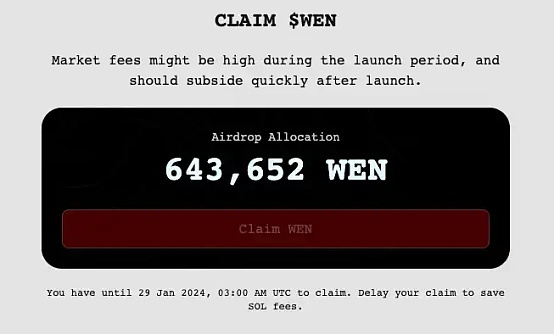 今日晚间 23: 00 ,WEN 的空投将正式开放申领,并持续至 UTC 时间 1 月 29 日 3: 00 (北京时间 11: 00)。由于所有符合条件的地址将均分空投奖励,这也意味着所有人拿到的空投数额都会相同,即 643652 枚 WEN。