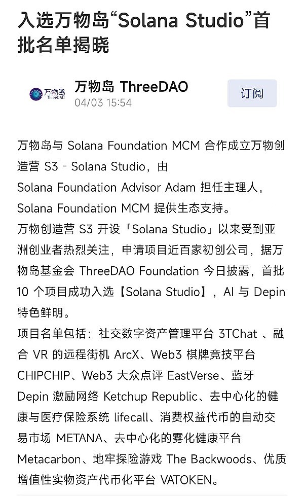 万物岛基金会ThreeDAOFoundation 今日披露,首批10个项目入选“Solana Studio”。据了解,3TChat就成功入选万物岛“Solana Studio”的首批名单,这标志着其在去中心化社交领域得到了进一步认可。