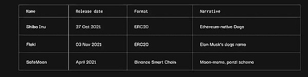 DOGE 的流行催生了更多的犬类 Meme 币,包括 Shiba Inu、Floki 和 Safemoon,所有这些都在短短的几个月内达到了估值高峰。