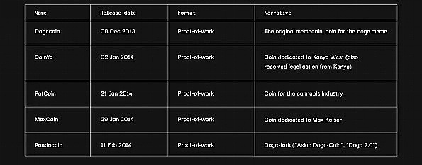 工作量证明 Meme 币主要是为矿工设计的,用于将他们的资源分配给新代币进行挖矿和销售。在这些 Meme 币中,很多都是在 Bitcointalk 加密货币论坛上的子区「alternative cryptocurrency」首次亮相的。尽管有相当多的 Meme 币未能进入交易所,但那些成功的 Meme 币则进入了 Cryptsy 和 BTC-E 等平台供交易者交易,这些中心化服务现在已经关闭。每个 Meme 币通常都通过名称和品牌、哈希算法、区块时间和供应量等因素来区分,所有这些共同促进了它们的整体叙事 (或者说「Meme」)。