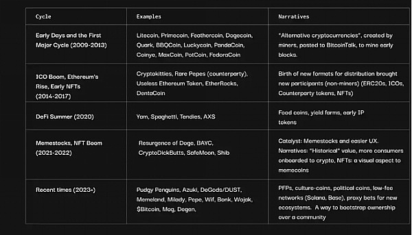 下面的表格和图例是对 Crypto 周期和这些周期里兴起的 Meme 币的简要介绍:
