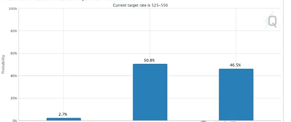 CME FedWatch 工具的最新数据显示, 2024 年降息的可能性被进一步推迟到年底。6 月份降息的可能性略高于 50%,比本周早些时候下降了 10%