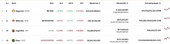 DOGE、PEPE 和 WIF 等主流 memecoin 最近几天并没有像 PUPS 那样幸运。事实上,所有这些代币的价格在过去一周都有所下降。