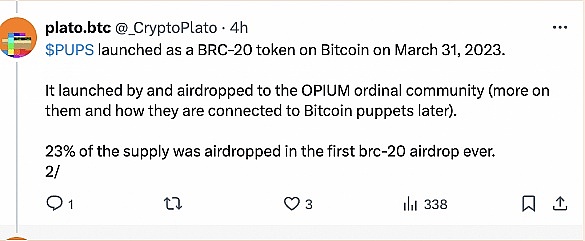 PUPS 证明了比特币生态系统中模因币文化的蓬勃发展。它于 2023 年 3 月推出,早于官方比特币木偶系列,将自己定位为 OG memecoin。空投到“OPIUM序数社区”的免费薄荷糖很快就获得了关注,成为社区内的一个巨大笑话。此次空投是比特币上的首次 BRC-20 空投,这是一项独特的技术壮举,进一步巩固了 PUPS 在比特币 Ordinal meme 领域的地位。