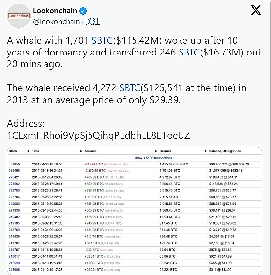 Lookonchain 和Whale Alert等多家链上数据提供商观察到了鲸鱼的第一次移动。这些资源显示,一位比特币投资者十年前以不到 30 美元的平均价格积累了近 4,300 比特币,因此决定转移一小部分。