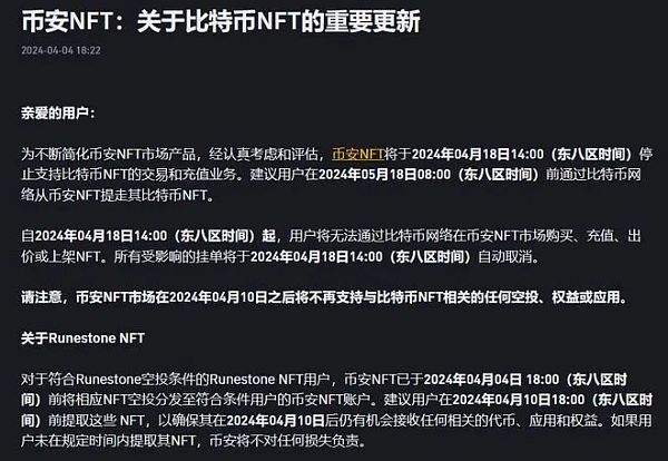 币安NFT市场在2024年04月10日之后将不再支持与比特币NFT相关的任何空投、权益或应用。