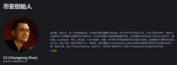 币安的创始人为赵长鹏,1977年出生于江苏连云港,现为币安大股东、比捷科技CEO。曾一度凭借加密货币市场的繁荣登顶华人首富,同时也跻身世界十大富豪。
