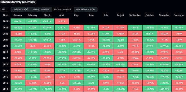 分析 Coinglass 的比特币月回报率历史数据,四月份传统上是比特币看涨的月份。尽管目前 2024 年 4 月的负回报率为-4.21%,但仔细研究就会发现,本月往往预示着一段积极势头的模式。