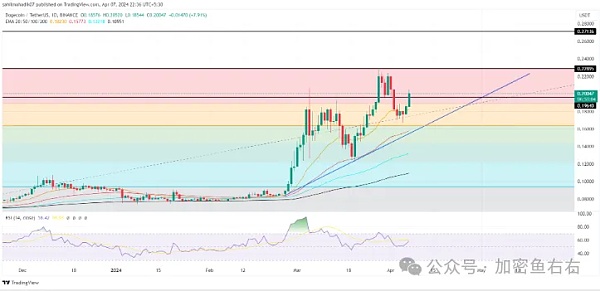 经过最近的调整后,DOGE价格跌至 0.17 美元的低点,然后上涨 20%,达到 0.2 美元。这一举措突破了 0.196 美元的关键阻力位,为进一步复苏奠定了基础。
