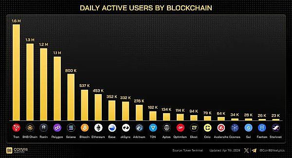 Coin98 Analytics今日在社交媒体发布了主流公链日活跃用户数排行,数据显示,波场TRON的日活跃用户达160万,继续占据领先地位。