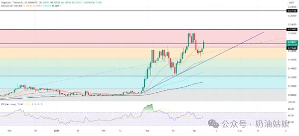 正如日线图上的上升趋势线所示,狗狗币的中期前景是乐观的。该趋势线在市场调整期间充当了可靠的支撑,预示着强劲的复苏趋势。经过最近的调整后,DOGE价格在 0.17 美元处找到支撑,然后飙升 20% 至 0.2 美元。这一走势克服了 0.196 美元的关键阻力位,为进一步复苏奠定了基础。
