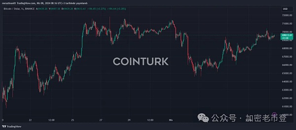 随着价格甚至突破了70,000美元的阻力位,最高水平达到了70,300美元左右。然而,价格目前正在修正涨幅,并已回落至 70,000 美元以下。比特币目前交易价格高于 68,000 美元水平,也高于 100 小时简单移动平均线。直接阻力位于 69,800 美元附近,而第一个主要阻力位于 70,000 美元。