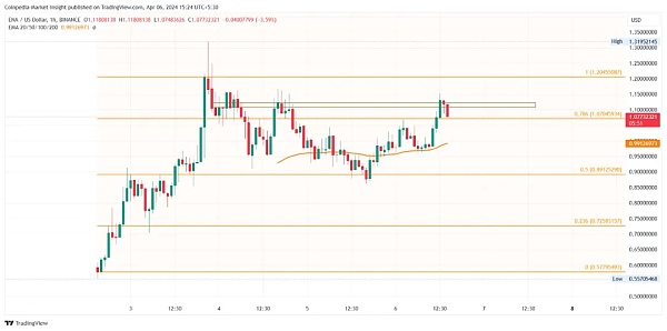 1 小时图上,ENA 价格显示从 50% 斐波那契水平看涨。由于颈线略高于 1 美元的心理关口,趋势走势还展示了潜在的头肩倒转形态。如果出现看涨突破,上升趋势可能会导致长期上升趋势,并可能触及 1.59 美元关口。