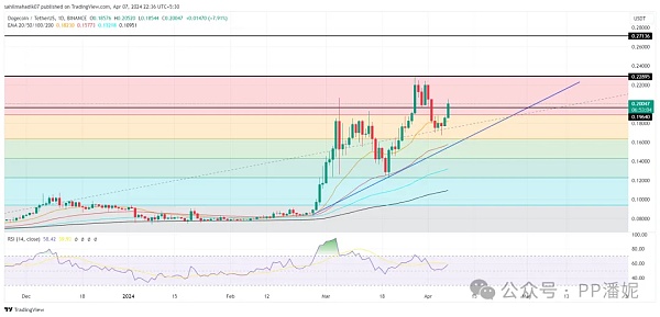 如果这种上涨势头持续下去,狗狗币的价格有望上涨14%,目标是突破0.228美元的关键水平。成功突破这一水平将进一步确认看涨趋势,并将复苏趋势的目标设定为0.271美元,随后可能达到0.3美元。