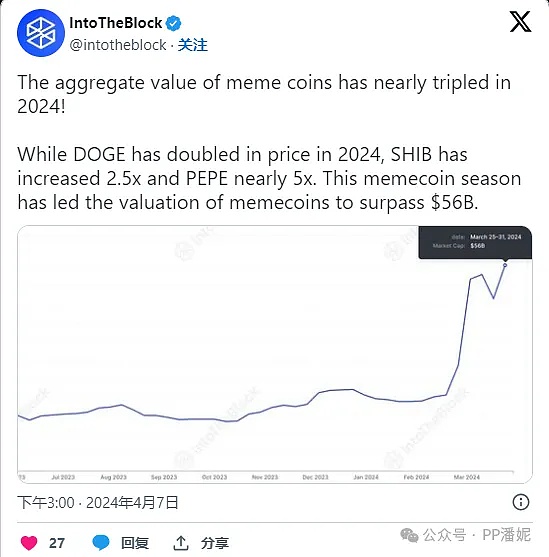 最近的一则分析推文中,IntoTheBlock强调了meme加密货币市场的显着增长,并预测到2024年总价值将翻倍增长。在表现出色的加密货币中,狗狗币(DOGE)的价格翻了一倍,而柴犬币(SHIB)的价格则暴涨了2.5倍。